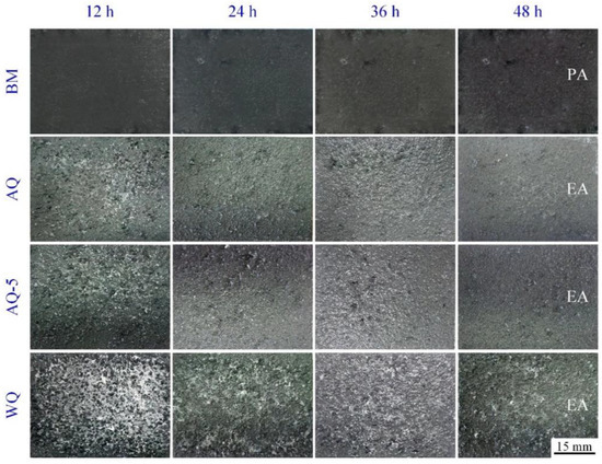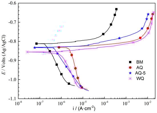 The polarization curves of BM and heat-treated samples with different quenching conditions are shown in Figure 9. The relevant parameters are acquired through Tafel extrapolation (in Table 3). The corrosion current density (icorr) of BM and the samples after NIHT with different quenching procedures are different and ranks in the following sequence: AQ>WQ>AQ-5>BM. Generally speaking, the larger corrosion current density will give rise to larger corrosion rate. The change trend evaluated with corrosion current density is consistent well with the results of IGC test and exfoliation corrosion experiment, and proves that the selected data from dynamic potential polarization curves is appropriate to estimate the corrosion current density (icorr), although the fitting data could be subjective. The anodic current densities are gradually heading towards a plateau, which demonstrates that the pitting growth is becoming limited by a mass transport procedure. This behavior is likely associated with the appearance of a salt film within it [34].