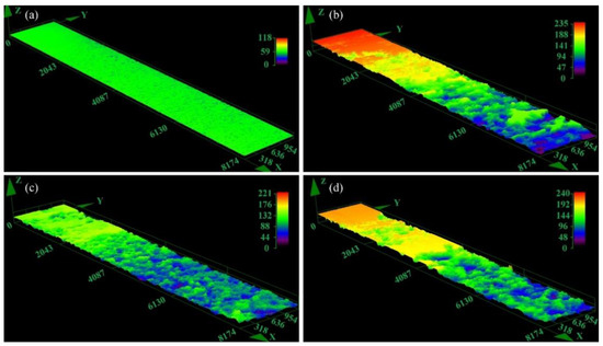 Three-dimensional optical micrographs without corrosion products after EXCO test: (a) BM, (b) AQ, (c) AQ-5, (d) WQ (Unit: μm ).