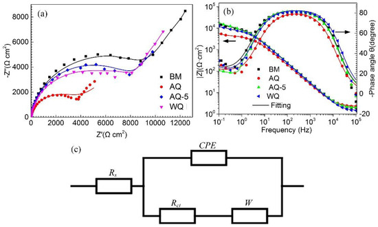 The EIS tests were carried out to study the electrochemical response of BM and the samples with different quenching processes. The test results are presented in the type of Nyquist and Bode-phase images, as shown in Figure 10. In the Nyquist image, a capacitive reactance arc forms in high-frequency area and a slash with a tilt angle appears in the low-frequency locations (in Figure 10a). This phenomenon reveals the existence of diffusion process known as Warburg impedance [35,36]. The transformation of EIS curve is mainly attributed to the change of the kinetics of corrosion procedure, possibly from charge transfer control to diffusion control. Additionally, the maxima of phase angle curves are lower than 90o, as shown in Bode plots of Figure 10b, which reveals the existence of a variance of ideal-capacitance with relative to the surface of specimens. The equivalent circuit in Figure 10c is applied to deal with the EIS data and the relevant electrochemical parameters are obtained through Zsimpwin software, as listed in Table 4. Rs means the solution resistance; Rct and W represent charge transfer and Warburg impedance, respectively. Since there is no pure capacitance in actual electrochemical interface, a constant phase element (CPE) is usually applied to acquire a more accurate fitting to the electrochemical data. Liu et al. pointed out that the total resistance Rct is inversely proportional to the corrosion rate [37]. The Rct is always used to evaluate the susceptibility to corrosion, and the higher Rct value represents a lower corrosion current density and thus a better corrosion resistance [20], as listed in Table 4. Consequently, the corrosion resistance of BM and heat-treated samples ranks in the following order: BM>AQ-5>WQ>AQ. Additionally, the deterioration of corrosion resistance can also be assessed by using Y values, and the corresponding variation trend of corrosion resistance is consistent with the laws evaluated through the Rct values [37].From Table 4, it can be seen that all the values of CPE power are near 0.90, which reflects a higher interface homogeneity as previously studied by Chang et al. [38]. The change trend of corrosion resistance of BM and heat-treated samples with different quenching processes obtained through the EIS results is consistent well with the immersion experiments.
