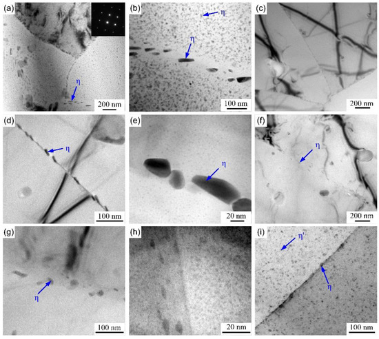 For 7000 series alloys, the widely recognized evolution of precipitation process is recommended as follows: supersaturated solid solution (α-sss)→Guinier-Preston zones (GP zones, MgZn)→η′ phase (MgZn2)→η phase (MgZn2) [39]. The Al-Zn-Mg alloy belongs to heat-treatable aluminum alloy and the precipitates will change due to different thermal cycles [1,16,40]. Figure 11 shows the precipitates evolution of heat-treated Al-Zn-Mg alloy with different thermal cycles. The microstructure of BM is composed of high densities η′ and η precipitates in matrix, discontinuous precipitates at grain boundaries and precipitate-free zones near the grain boundaries, as shown in Figure 11a,b. For sample AQ, almost all precipitates in matrix (η′ and η phases) dissolve judging from Figure 11c,d. However, high densities GP zones appear in higher magnification image in Figure 11e, which most likely attribute to the natural ageing after NIHT. Additionally, the precipitates at grain boundary of sample AQ suffered dissolution and re-precipitation, and then become continuous, which is harmful to the corrosion resistance of Al-Zn-Mg alloy [6,20,23]. The matrix precipitates of sample AQ-5 have similar evolution process except for precipitates at grain boundary, as seen in Figure 11f–h. The grain boundary precipitates of sample AQ-5 show discontinuous morphology, which is benefited to decrease the susceptibility to corrosion. There are still some matrix and grain boundary precipitates in sample WQ, which can be ascribed to different quenching conditions during NIHT process, as shown in Figure 11i.