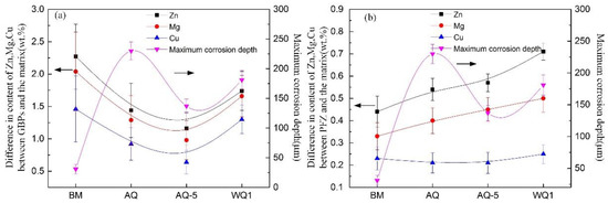 The microchemistry was also analyzed by measuring the chemical compositions of GBPs, PFZs and matrix. In Song’s [23] and Liu’s [20] work, the variation of Zn, Mg, Cu of grain boundary precipitates and precipitate-free zones near grain boundaries with different quenching rates was examined, but they neglected the change of elements in matrix. It was mainly related to the heat treatment process in their papers. The relevant heat treatment procedure can be summarized as follows, solution heat treatment + quenching (with different quenching rate) + artificial ageing. In the last step of artificial ageing, lots of precipitates in matrix formed and the corresponding corrosion potential of matrix increased due to the decrease of Zn content. The relevant investigations have proven that the corrosion potential of GBPs and PFZs are higher than that of matrix [6,20,23,30]. Therefore, only the variation of element in grain boundary precipitates and precipitate-free zones was considered. The microstructure evolution in matrix of heat-treated specimens, namely from η′ or η precipitates to GP zones formed in natural ageing, will lead to the increase of Zn content in matrix [41,42], and then lead to the decrease of potential in matrix. The element content in grain boundary precipitates and precipitate-free zones will be affected by the diffusion from matrix to grain boundaries and the evolution of precipitates at grain boundary, the change has complex effect on the potential of grain boundary precipitates and precipitate-free zones. Then these factors affect the corrosion resistance of heat-treated specimens with different quenching conditions. The relevant investigations have pointed out that the variation of corrosion resistance for 7000 series alloy is primarily related to two factors [6,20,23,43]: (I) the area fraction of grain boundary precipitates and the width of precipitate-free zones; (II) the corresponding potential difference between the aluminum matrix and grain boundary precipitates, precipitate-free zones. Consequently, the Zn, Mg, Cu contents differences between the grain boundaries and matrix, and the precipitate-free zones and matrix are counted, as shown in Figure 12. From Figure 12a, the difference of Zn between GBPs and matrix is larger than that of Mg and Cu. In addition, the difference of Zn, Mg and Cu between precipitates at grain boundary and matrix displays same variation trend with different quenching conditions, namely gradually decreased from the BM to specimens AQ-5, and then increased. Figure 12b shows that the difference of Zn and Mg between precipitate-free zones and matrix increases from BM to specimen WQ, however, the difference of Cu content remains almost unchanged.