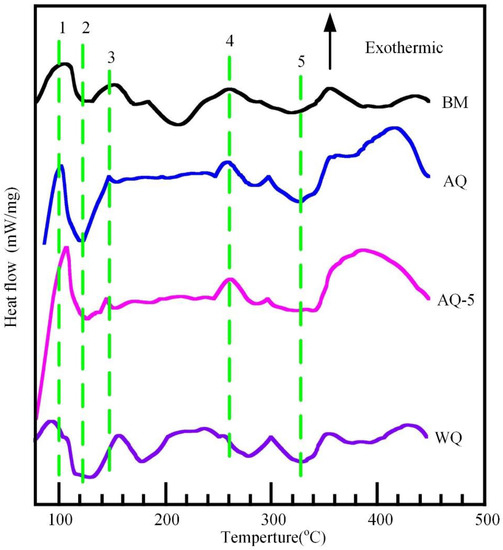 DSC experiment is always be used in conjunction with TEM investigations to characterize the microstructural evolution, as shown in Figure 13. The exact locations of all peaks are related to the alloy composition, heating rate and the initial state of heat treatment prior to DSC test [44,45]. For the sample BM, an exothermic reaction (peak 1) can be obtained with the temperature range from 75 °C to 110 °C, demonstrating the formation of GP zones [44,46]. The endothermic peak 2 covering 110 °C–130 °C range is most likely associated with the dissolution of GP zones. Subsequently, a slight exothermic reaction (peak 3) occurred in 130 °C–170 °C span corresponding to the precipitation of η′ phases. The exothermic reaction (peak 4) is subsequently acquired with the temperature range of 210 °C–280 °C, which indicates the formation of η phases. The dissolution of η′ and η phases occur when the temperature increase, resulting in the formation of endothermic reaction (peak 5) in 280 °C–350 °C span. The exothermic and endothermic reactions are related to the appearance and dissolution of S and T precipitates when the temperature is higher than 350 °C [44,47]. The variation trend of DSC for sample WQ is similar with that of specimen BM. However, the intensity of exothermic peak 3 for specimen WQ is obvious compared with the sample BM, which is most likely attributed to the difference of initial temper of samples. For samples AQ and AQ-5, the very wide temperature range of endothermic peak 2 (~100 °C–190 °C) suggests that lots of GP zones dissolved during DSC test. It means that lots of GP zones appeared during natural ageing process after NIHT. Additionally, it is likely that some reactions were overlapped under the endothermic peak 2, such as peak 3 [44]. The DSC analysis indicates the difference of precipitates in BM and heat-treated specimens.
