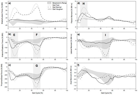 Comparison between in silico: medial/lateral force (a), anterior/posterior force (b), proximal/distal force (c), flexion moment (d), lateral moment (e), and axial moment (f) from three gait types and the in vivo values obtained by Bergman [].