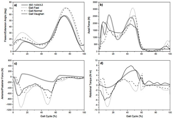 Comparison between in silico: flexion/extension angle (a), axial force (b), anterior/posterior force (c), and rotational torque (d) from three gait types and the ISO 1423-3 values.