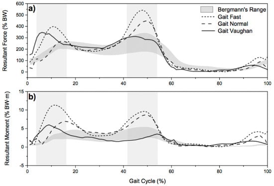 Comparison between in silico resultant force (a) and resultant moment (b) from three gait types and the in vivo values obtained by Bergman [].