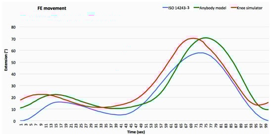 Representation of the femoral/extension movement of the Anybody model of the ISO standard 14243-3 and knee simulator.