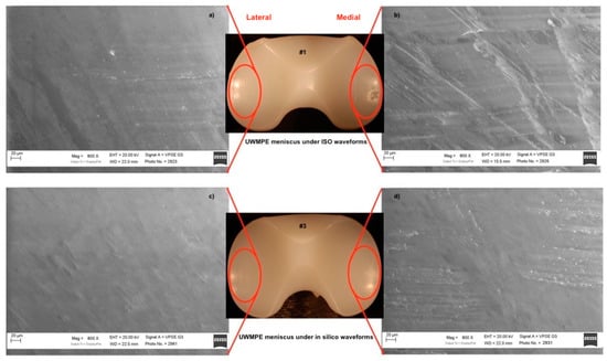 The worn UHMWPE inserts deriving from the ISO and multibody simulation were analyzed in the most worn areas. The analyses were performed using the SEM in order to assess the pits and scratches on the menisci surfaces. The area and extent of the focal scar damage observed on the menisci components used under ISO waveforms were different from the menisci components used under in silico simulation. In fact, in Figure 6a,b, it is possible to observe, on the meniscus that run under the ISO waveforms, scratches pattern along the femoral sliding (anterior/posterior (AP) direction). Pits of various dimensions were observed on the articulating surface, and craters were also detected on the lateral compartment. These scratches were probably generated during the wear tests by third-body particles produced in turn by the polishing and entrapment phenomena between the bearing surfaces. A small amount of burnishing and scratches were visible along the AP direction of the menisci that run under in silico multibody waveforms (Figure 6c,d).
