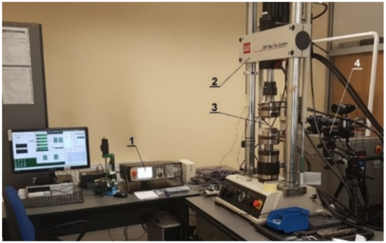 Station for the experimental tests (1—FlexText SE40 controller; 2—testing machine; 3—specimen; 4—ARAMIS 3D 4M system).