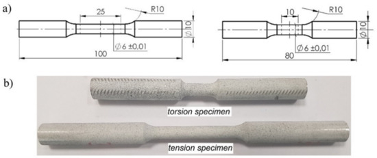 The basic strength parameters and the relationships between the tensile force and the elongation of the gauge length of specimen F(u) and between the torsional moment and the torsional angle of the measuring base Ms (φ) were determined using the axisymmetric specimens presented in Figure 2. In the investigations, cylindrical specimens with an original diameter of ϕ = 6 mm were used and the original gauge length was L0 = 25 mm in the case of a tensile specimen and L0 = 10 mm in the case of a torsion specimen. The smaller gauge length of the torsional specimen was due to the limited torsional range of the testing machine and the ARAMIS measuring system. For a specimen gauge length equal to 25 mm, the maximum torsional angle was approximate to 140°. The maximal torsional angle for the measuring system was equal to 110°.
