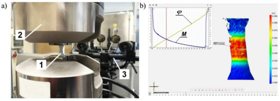 (a) The specimen in the machine’s grip with a sprayed external surface during the torsional test (1—specimen; 2—hydraulic grip; 3—ARAMIS 3D 4M system), (b) Vision system dialogue (ARAMIS 3D 4M).