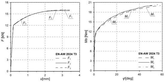 It should be noted that the shapes of the curves F(u) and M(φ) are both characterized by a mild course of hardening across almost the whole range. In the case of the F(u) plot, a slight decrease in the value of force was observed at the moment of failure in relation to the maximum value. The presented results show that the loading force increased across almost the whole range, showing only a slight decrease in the final phase of the loading process. The decrease in load was also the result of a reduction in the area obtained in the gauge length of the specimen.