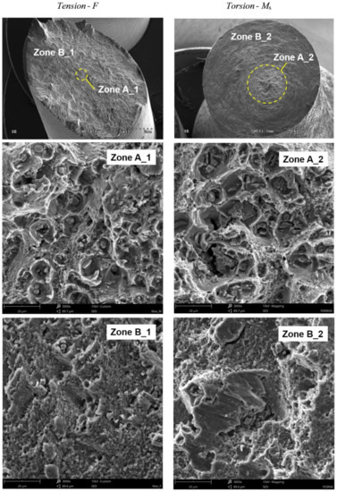 From the obtained fracture surfaces of the specimens (Figure 5), a working fracture mechanism could be determined in dependence on the working load. In the case of a tensile test, it should be noted that the fracture surface was almost completely covered with a plane sloping at an angle to the plane perpendicular to the axis of the specimen. Only a small area lying on a plane perpendicular to the axis of the specimen, located in its central part, could be extracted. In this zone (Figure 5, Zone A_1 and Zone A_2), dimples were visible after the deformation of pores in the load direction, which may indicate the dominance of the maximum principal stresses (or strains) in the fracture process. In the remaining part of the fracture surface sloping at an angle, the obtained dimples showed that the maximum shear stresses determined the failure (Figure 5, Zone B_1 and Zone B_2). In the case of a fracture surface obtained from the pure torsion test, only one surface was visible, which was perpendicular to the axis of the specimen. On the prevailing part (Zone B_1, Zone B_2), visible dimples sloped at an angle and had a slender and flattened shape. This was the result of the working load. On this surface, we could also distinguish a small area located in the central part of the fracture surface where we could see a clear difference in the shape of the dimples formed in the final process of specimen decohesion. Their shape was similar to the dimples located in Zone A, which indicates the effect of another fracture mechanism related to the existence of a macro-crack at the circumference of the specimen.