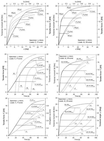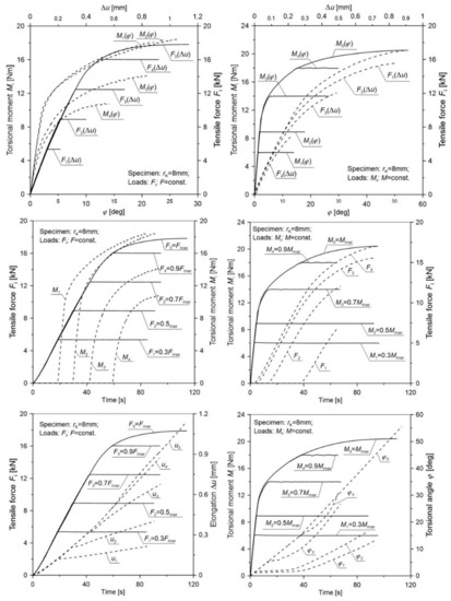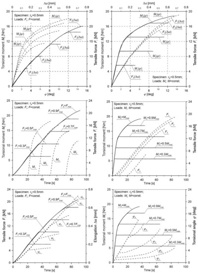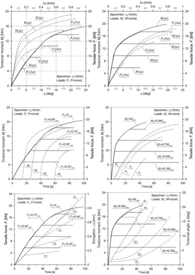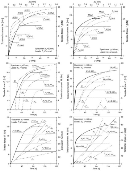 Table 4 presents the averaged values for the elongation and torsional angle of the gauge length and tensile force as well as the torsion moment for notched specimens in various load configurations. In order to transparently reflect the selected load scheme additionally in the figures (Figure 8, Figure 9, Figure 10, Figure 11 and Figure 12), the load (tensile force F and torsion moment M) as well as the elongation u and torsional angle φ with respect to the duration of the test were presented.