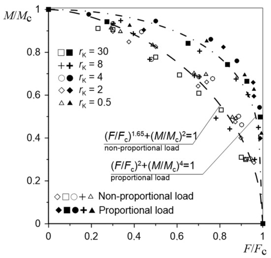 Figure 13 presents the values of tensile forces and torsional moments causing fracture initiation in notched specimens with different radii for different load configurations. These were compared with critical values of proportional loads [12] and can be described in an equally simple way by the following equation: