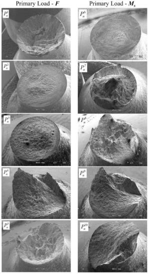 On analyzing the fracture surface on a macroscopic scale, it was noticed that the effect of non-proportional loads had a significant influence on the macroscopic form of the fracture surface. Figure 15 shows the obtained fracture surfaces for specimens depending on the selected load configuration. Attention was paid to changing its shape depending on the load scheme.