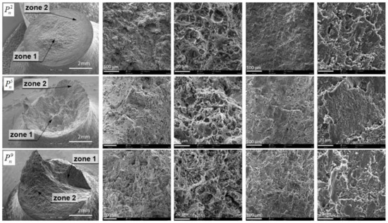 In the case of load configuration , we can clearly distinguish two zones (Figure 16), which confirmed a diversified fracture mechanism. In the central area (Zone 1), dimples were visible after the deformation of pores in the direction of the tensile load, which may indicate the dominance of the maximum principal stresses (or strain) in the fracture process. On the external area of the fracture surface (Zone 2), the dimples were oriented in the direction of rotation, which resulted from the applied load in the form of a torsional moment. It should be assumed that the maximum shear stresses determined the failure in this area. The shape of the dimples was similar to that obtained in the test of pure torsion of a smooth specimen. The share of the central area in the whole fracture surface increased at the expense of the external area for the load case . For the load scheme , the shape of the fracture surface changed completely, taking the form of a spatial surface on which it is difficult to specify the zones with different fracture mechanisms. A similar shape was also obtained for scheme , which showed that with these load configurations, the fracture mechanisms were close together. In the case of load in the configuration , the fracture surface was almost identical to that obtained under the load , which was characterized by the typical shape obtained from the tension of cylindrical elements made of ductile materials. Therefore, it should be assumed that with such a high level of tensile force , the secondary load in the form of torsion had little effect on the shape of the fracture surface and working fracture mechanisms. For load configurations where the primary load was torsional moment, each fracture surface obtained differed from the others. Therefore, it should be assumed that configurations from to , where the torsion moment was the primary load, had a key effect on the fracture mechanisms during decohesion of the specimen.