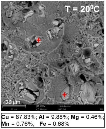 It was observed that on each fracture surface at the bottom of the majority of dimples created, there were numerous precipitates (elements of the second phase) [35]. Based on the analysis of the chemical composition (Figure 17) by means of an integrated EDS detector (energy dispersive spectroscopy), the weight percentage of Cu (copper) at the level of 90% in precipitates of the secondary phase was determined.