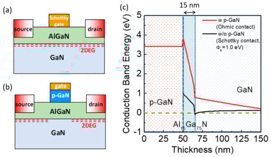 - Chen, K.J.; Zhou, C. Enhancement-mode AlGaN/GaN HEMT and MIS-HEMT technology. Phys. Status Solidi A 2011, 208, 434–438. [Google Scholar] [CrossRef]