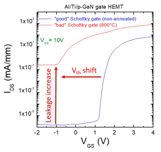 - Stockman, A.; Canato, E.; Tajalli, A.; Meneghini, M.; Meneghesso, G.; Zanoni, E.; Moens, P.; Bakeroot, B. On the origin of the leakage current in p-Gate AlGaN/GaN HEMTs. In Proceedings of the 2018 IEEE International Reliability Physics Symposium (IRPS2018), Burlingame, CA, USA, 11–15 March 2018; pp. 4B.5–1–4B.5–4. [Google Scholar] [CrossRef]