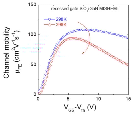 - Fiorenza, P.; Greco, G.; Iucolano, F.; Patti, A.; Roccaforte, F. Channel Mobility in GaN Hybrid MOS-HEMT Using SiO2 as Gate Insulator. IEEE Trans. Electron Devices 2017, 64, 2893–2899. [Google Scholar] [CrossRef]