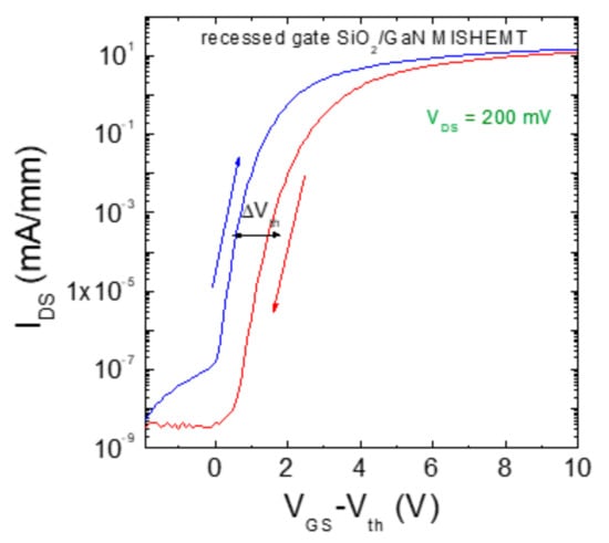 - Fiorenza, P.; Greco, G.; Giannazzo, F.; Iucolano, F.; Roccaforte, F. Effects of interface states and near interface traps on the threshold voltage stability of GaN and SiC transistors employing SiO2 as gate dielectric. J. Vac. Sci. Technol. B 2017, 35, 01A101. [Google Scholar] [CrossRef]