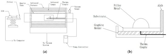 Figure 1a displays the experimental installation of the wetting angle test, and it contains infrared lamps, a sample holder, and a CCD recording system []. The infrared furnace (SINKO-RIKO RHL-816C, ULVAC, Tokyo, Japan) under a vacuum of 5 × 10−8 bar was used in the wetting angle and brazing experiments. Infrared furnace heating rate was fixed at 10 °C/s during the test. The braze alloy prepared by a vacuum arc remelting furnace with a near spherical shape, weighing 0.15 g was applied in the wetting angle experiment. Figure 1b shows the thermocouple location of the specimen holder, and the thermocouple was in contact with the specimen holder [].