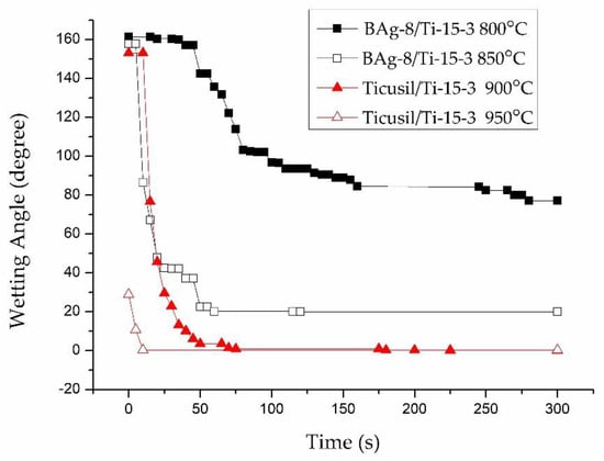 Figure 3 illustrates the dynamic wetting behaviors of the BAg-8 and Ticusil® filler metals on Ti-15-3 substrate at various temperatures for 300 s. From Figure 3, one can find that the BAg-8 braze could not well wet the Ti-15-3 substrate at 800 °C, but the wettability was greatly increased by increasing the testing temperature to 850 °C, at which the wetting angle of 20° was readily reached after 60 s. On the other hand, the molten BAg-8 braze demonstrated poor wettability on a Ti50Ni50 substrate, even when the testing temperature was increased to 850 °C []. Figure 3 also shows the dynamic wetting angle behavior of the Ticusil® alloy on Ti-15-3 base metal at 900 and 950 °C. The molten Ticusil® braze effectively wetted the Ti-15-3 substrate, and the wettability was slightly improved by increasing the test temperature from 900 °C to 950 °C. The wetting angle approached zero after 70 s in both test conditions. Unlike the BAg-8 filler metal, the Ticusil® alloyed with 4.5 wt.% Ti active ingredient, which greatly ameliorates wetting on both Ti-15-3 and Ti50Ni50 substrates [].