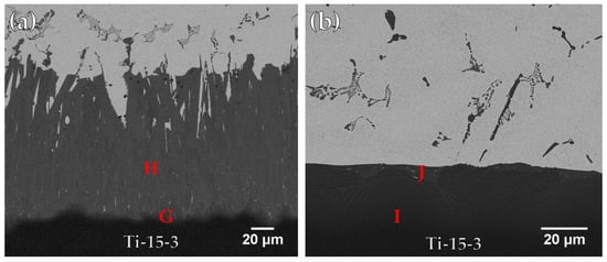 Figure 5 and Table 3 present FESEM BEIs and chemical analysis results using the Ticusil® filler metal after wetting angle tests of Ti-15-3 base metal at 900 and 950 °C for 300 s, respectively, in which interfacial reaction layers between the braze and base metal are found. In Figure 5a, it can be seen that the Cu content in the braze melt reacted vigorously with Ti and formed a gray Ti-Cu-V reaction layer (marked G) next to the Ti-15-3 substrate. A very thick CuTi intermetallic layer (marked H) is also visible. In Figure 5b, the thickness of the CuTi reaction layer was decreased due to better fluidity of the braze melt at increased brazing temperature. Most of the molten melt overflowed out of the joint without reacting with the Ti-15-3 substrate.