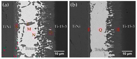 Figure 6b displays FESEM BEI and EDS chemical analysis results of a Ti-15-3/BAg-8/Ti50Ni50 specimen infrared brazed at 850 °C for 300 s. Increasing the brazing temperature enhances the interfacial reaction among the braze melt and two substrates. Most of Cu in the molten braze readily react with Ti50Ni50 and Ti-15-3 substrates to form interfacial (CuxNi1−x)2Ti and Cu(Ti,V) reaction layers. According to Figure 6b, the Cu content in the molten BAg-8 braze was almost completely consumed. No Ag-Cu eutectic is visible in the figure, and only the white Ag-rich matrix, marked Q, remains in the center of the brazed joint. Meanwhile, the Cu2Ti phase disappears from the brazed joint at higher brazing temperature due to the enhanced interfacial reactions which consume Cu in the braze melt.