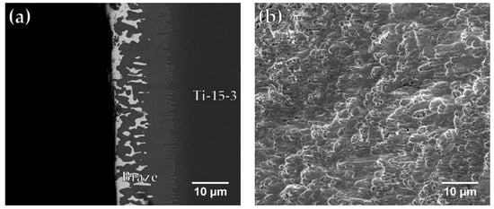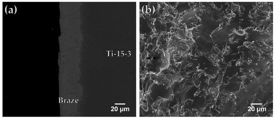 Figure 8a,b present an SEM BEI cross-section and a SEI fractograph of the fractured Ti-15-3/BAg-8/ Ti50Ni50 joint brazed at 850 °C for 300 s. The brazed specimen in Figure 8a fractured between the interfacial Cu(Ti,V) reaction layer and the Ag-rich matrix. The fractograph shown in Figure 8b presents quasi-cleavage fracture, and the morphology of fractured surface is mixed with ductile dimples and brittle facets. Figure 9a,b show an FESEM BEI cross-section and an SEI fractograph of the joint brazed at 950 °C for 300 s. The fracture location shown in Figure 9a is along the central brittle Ti2Ni intermetallic compound. The existence of central brittle intermetallics in the joint results in brittle cleavage fracture of the entire SEI fractograph as illustrated in Figure 9b.