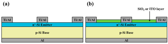 Schematic diagram of (a) the bare solar cell, (b) cell with SiO2 (250 nm) or ITO (54 nm) antireflective layer. ITO, indium-tin-oxide.