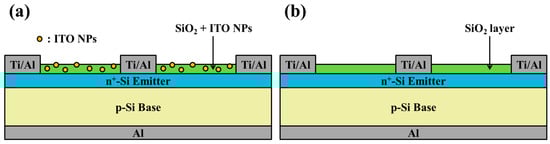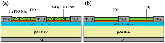 Schematic diagram of (a) a silicon solar cell coated with a compound ARC comprising an ITO layer (53 nm) and a layer of SiO2 and dispersed ITO-NPs (250 nm); (b) a silicon solar cell coated with a compound ARC comprising an ITO layer (54 nm) and a SiO2 layer that did not contain ITO-NPs (250 nm).