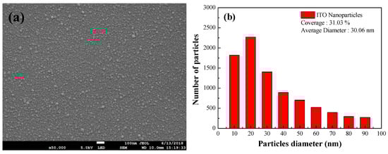 Top-view SEM images of (a) 3 wt% ITO NPs dispersed in the SiO2 layer; (b) size distribution and coverage of 3 wt% ITO NPs, respectively calculated using Image-J software on the SEM image.