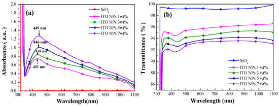(a) The absorbance spectra of ITO NPs dispersed in the SiO2 layer at a concentration of 1, 3, 5, or 7 wt%; (b) optical transmittance of ITO NPs dispersed in the SiO2 layer at a concentration of 1, 3, 5, or 7 wt%.