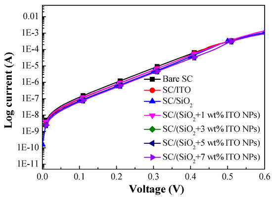 Dark I-V curves of the bare silicon solar cell, a solar cell coated with a SiO2 layer (no ITO-NPs), a solar cell with an ITO layer, and solar cells coated with a layer of SiO2 containing various concentrations of ITO-NPs.