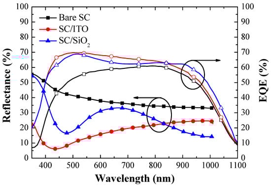 Optical reflectance spectra and external quantum efficiency (EQE) responses of the bare silicon solar cell, the solar cell with a SiO2 layer, and the solar cell with an ITO layer.