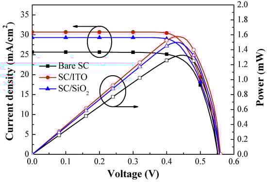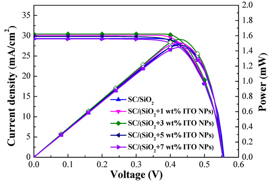 Figure 10 presents photovoltaic J-V curves of the cell coated with a layer of SiO2 (without ITO-NPs) and cells coated with a layer of SiO2 that contained ITO-NPs at a concentration of 1, 3, 5, or 7 wt%. Table 3 lists the photovoltaic performance of the same cells. The Jsc values were as follows: SC/SiO2 without ITO-NPs (29.30 mA/cm2), SC/SiO2 + 1 wt% ITO-NPs (30.01 mA/cm2), SC/SiO2 + 3 wt% ITO-NPs (30.41 mA/cm2), SC/SiO2 + 5 wt% ITO-NPs (29.71 mA/cm2), and SC/SiO2 + 7 wt% ITO-NPs (29.06 mA/cm2). The η values were as follows: SC/SiO2 without ITO-NPs (12.30%), SC/SiO2 + 1 wt% ITO-NPs (12.43%), SC/SiO2 + 3 wt% ITO-NPs (12.58%), SC/SiO2 + 5 wt% ITO-NPs (12.23%), and SC/SiO2 + 7 wt% ITO-NPs (11.90%). The highest Jsc and η values were obtained from the cell with 3 wt% ITO-NPs. The highest output power (Pmax = 1.55 mW) was obtained from the cell with an ARC of SiO2 and 3 wt% of ITO NPs. Based on these results, we employed a layer of SiO2 containing 3 wt% ITO-NPs in subsequent experiments for the cells with a compound ITO/SiO2 ARC comprising ITO-NPs dispersed in SiO2 layer.