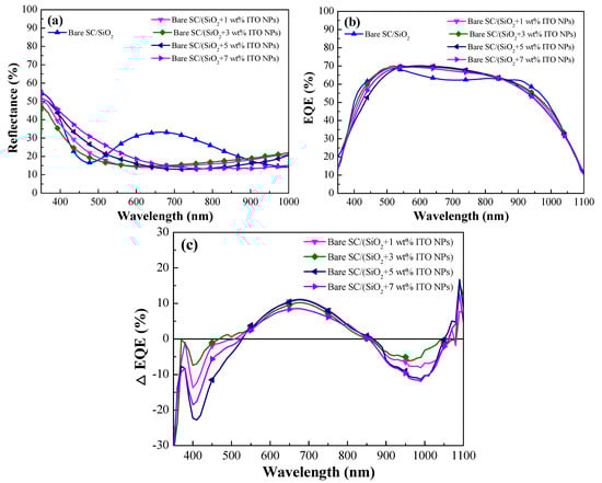 Figure 9b presents EQE responses of a solar cell with a SiO2 ARC and solar cells coated with a layer of SiO2 ARC containing ITO-NPs at a concentration of 1, 3, 5, or 7 wt%. The EQEW values of the same cells are listed in Table 2. EQEW values became greater as the concentration of ITO-NPs increased from 1 wt% to 3 wt%; however, EQEW values decreased when the concentration of ITO-NPs exceeded 5 wt%. When high concentrations of ITO-NPs were added to SiO2 coatings, visible effects were produced. Thus, the decrease in EQEW values at higher concentrations of ITO-NPs (>5 wt%) can be attributed to the effects of shading and the high reflectivity of small island-like pieces of ITO particles. Overall, the EQE responses of cells with ITO-NPs were in strong agreement with optical reflectance values, and the highest EQE was obtained when the concentration of ITO-NPs was 3 wt%. Furthermore, we investigated the plasmonic effects of ITO-NPs dispersed in SiO2 ARC on the cells by EQE enhancements (ΔEQE), as shown in Figure 9c. Here, we defined ΔEQE of the cells as follows: