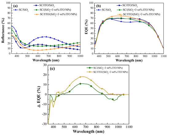 (a) Optical reflectance spectra of a cell coated with a layer of SiO2 and cell coated with a layer of SiO2 containing various concentrations of ITO-NPs; (b) external quantum efficiency (EQE) responses of the same cells; (c) EQE enhancements (ΔEQE) of the same cells, which was compared with the cell with a layer of SiO2.