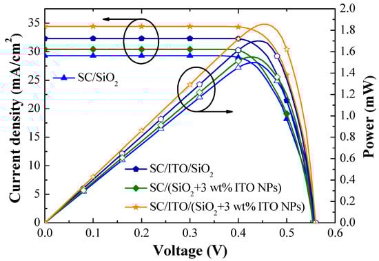 Photovoltaic J–V curves of the cell coated with a layer of SiO2 (without ITO-NPs) and cells with a layer of SiO2 containing various concentrations of ITO-NPs.