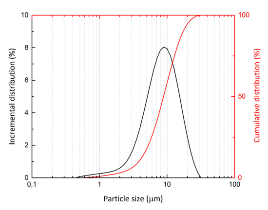 Standard quartz sand with a maximum grain size of 2.5 mm was used as filler in order to prepare AAS mortars. Graphite powder (COND 96-8, Graphite Týn, Týn nad Vltavou, Czech Republic) was added to the AAS composite in order to increase electrical conductivity. Its particle size distribution determined by laser granulometry is presented in Figure 1 and the average grain size was d50 = 6.4 µm and d90 = 13.0 µm. The Brunauer–Emmett–Teller (BET) surface area [40] of the graphite determined by nitrogen absorption was 15.42 m2 g−1. Triton X-100 (Sigma-Aldrich, St. Louis, MO, USA) was used as a dispersing agent for the graphite powder. It was added to the graphite suspension in the form of a 0.5% solution. In order to avoid the formation of large pores due to air entrapped during mixing, a 1% solution of the siloxane-based air-detraining agent, Lukosan S (Lučební závody, Kolín, Czech Republic), was used.