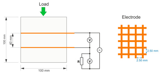 Two types of specimens were prepared—the prismatic specimens of the size 40 mm × 40 mm × 160 mm were used for the measurement of electrical properties and mechanical tests and 100 mm × 100 mm × 100 mm cubes with embedded electrodes were used for the investigation of self-sensing properties. The gauze electrodes were made of copper with a wire thickness of 1 mm and a mesh size of 2.5 mm. The size of the electrodes was 80 mm × 120 mm and the distance between them was 40 mm (Figure 2).