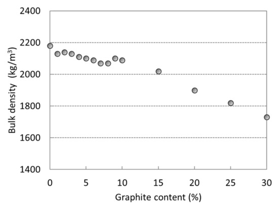A similar trend as in the case of flexural strength was also observed for the bulk density measurements (Figure 5). After the addition of graphite in amounts of up to 10% of the slag mass, the bulk density decreased only by 5%. Due to the much lower density of graphite compared to the slag, higher amounts of graphite caused a significant (20% maximum) decrease in the bulk density of the AAS composite.