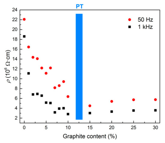Change in the electrical resistivity of AAS composites with respect to graphite content at 50 Hz and 1 kHz (PT = percolation threshold).