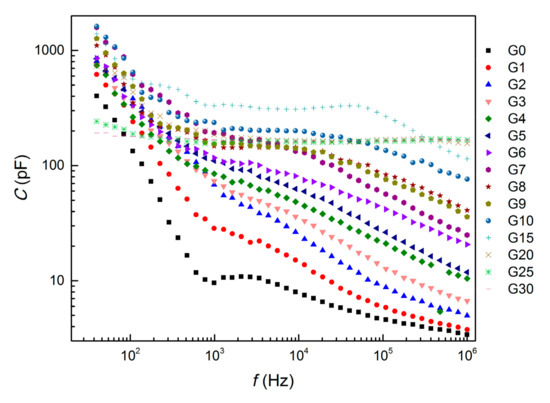 where S is the surface area of the electrodes and l is the distance between them. The capacitance was calculated according to Equation (3), where f is the frequency of the AC source.