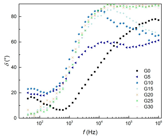 The loss angle δ determined for the complex impedance of AAS composites is presented in Figure 10, and for better distinguishability of the differences, only curves for selected mixtures (with graphite content increasing in 5% steps) were depicted. Low δ indicates that resistivity predominates, whereas at high δ the capacitance has the main controlling influence on the impedance. The loss angle generally increased with AC frequency, meaning that the imaginary part of the electrical impedance exceeds the real one at elevated frequencies. The local minimum was observed in the curve of the reference G0 mixture and its frequency directly corresponds to the peak in the resistivity curve. This indicates that in the range of 0.1–1 kHz the resistance strongly predominates over the capacitive reactance in the pure AAS mortar. When the graphite content was above the percolation threshold, at low frequencies, the impedance was controlled by the resistance component, but at frequencies above 10 kHz, the capacitive component predominated.