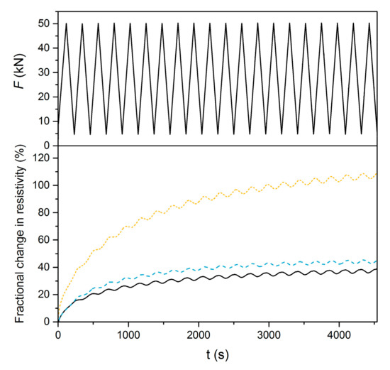 The self-sensing properties of building materials have their origin in the alteration of the conductive pathways inside composite materials, so the changes in resistivity, expressed as the fractional change in resistivity (FCR), are able to measure the sensing behaviour. The main advantage of the FCR parameter is that it is independent from loading conditions, and can be calculated as follows: