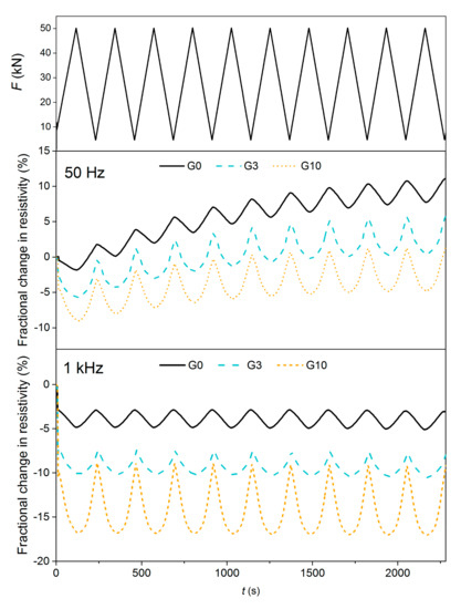 The self-sensing properties under compression were also tested using AC measurement at two different frequencies, 50 Hz and 1 kHz (Figure 12). Compression sensitivity tested at 50 Hz still showed some polarization effect, although it was not as significant as with the DC measurement. The average difference between the local minimum and maximum increased for the G3 and G10 mixtures to 5.2% and 6.0%, respectively. Finally, no polarization occurred when the frequency of 1 kHz was applied. At this frequency, mixture G10 showed the highest sensing sensitivity, with an FCR interval of 8.6%. However, graphite filler had the adverse effect of causing aggravated sensitivity near the maximum loading force, which is represented by the U-shape of the FCR curve within one loading cycle. This is most significant with the G10 mixture for which the graphite content almost reached the percolation threshold. The abnormal decrease and non-linearity of FCR at the beginning of compressive loading between 0 and 0.5 MPa is attributed to the change in contact resistance, which is common for the two-probe method [48]. However, this phenomenon does not affect the ability to detect changes in resistance when the two-probe method is used [49,50].