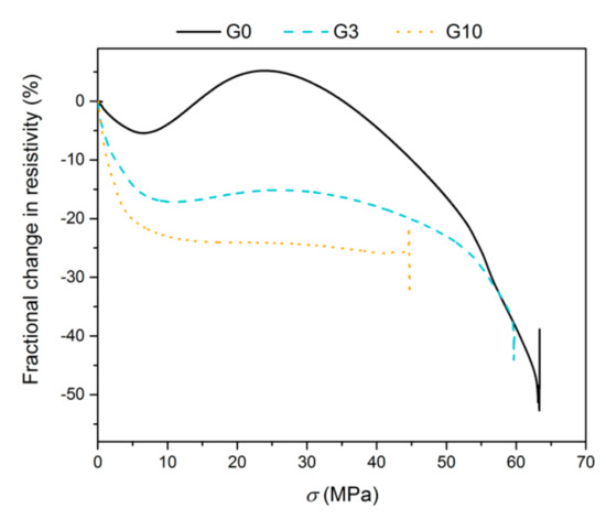 Fractional change in resistivity vs. compressive stress of composites G0, G3 and G10 measured at 1 kHz until the complete destruction of the specimens.