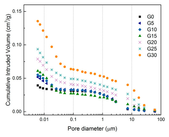 The microstructure of the AAS composites with conductive filler was analysed by means of scanning electron microscopy and mercury intrusion porosimetry. Pore distribution curves showing cumulative intruded volume versus pore diameter are depicted in Figure 14. The data show that the majority of the pore volume in the reference AAS mortar lies in the pore diameter range of 1–10 µm. After the addition of up to 10 wt% of graphite powder, only a small increase in pore volume associated with gel pores below 20 nm in diameter was observed. Greater amounts of graphite filler caused a remarkable increase in the volume of gel pores, as well as pores which are larger than 7 µm. This led to an overall increase in porosity, which was reflected in a drop in bulk density. The increase in volume, especially of large pores, can be also associated with the strength deterioration of the mixtures with the graphite content more than 10 wt%. The increase in volume of gel pores is probably associated with partial delamination of graphite platelets as can be observed in Figure 15 and partially it is influenced by the high amount of the organic additives which aggravate the formation of denser hydration products.